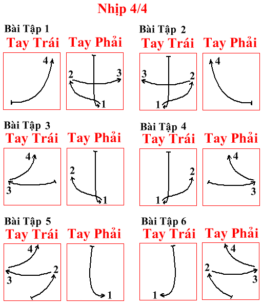 NHỊP 4/4:  Bài tập 1: Tay phải đánh nhịp 1 , 2 và 3 - Tay trái đánh nhịp 4 . Bài tập 2: Tay trái đánh nhịp 1 , 2 và 3 - Tay phải đánh nhịp 4 . Bài tập 3: Tay phải đánh nhịp 1 và 2 - Tay trái đánh nhịp 3 và 4 . Bài tập 4: Tay trái đánh nhịp 1 và 2 - Tay phải đánh nhịp 3 và 4 . Bài tập 5: Tay phải đánh nhịp 1 - Tay trái đánh nhịp 2 , 3 và 4 . Bài tập 6: Tay trái đánh nhịp 1 - Tay phải đánh nhịp 2 , 3 và 4 .